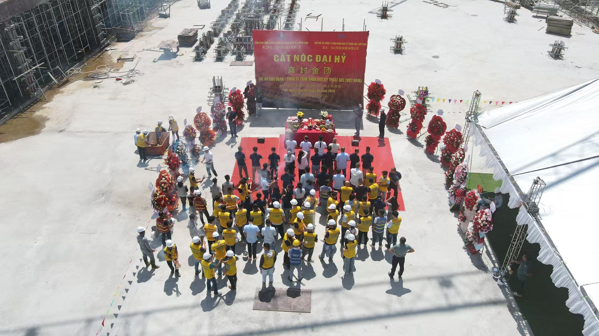 2025年6月25日(農(nóng)歷六月初一)上午,AVC科技(越南)有限公司三期土建工程項(xiàng)目榮耀封頂!在聲聲喜慶的禮炮聲和掌聲中,封頂儀式圓滿成功!